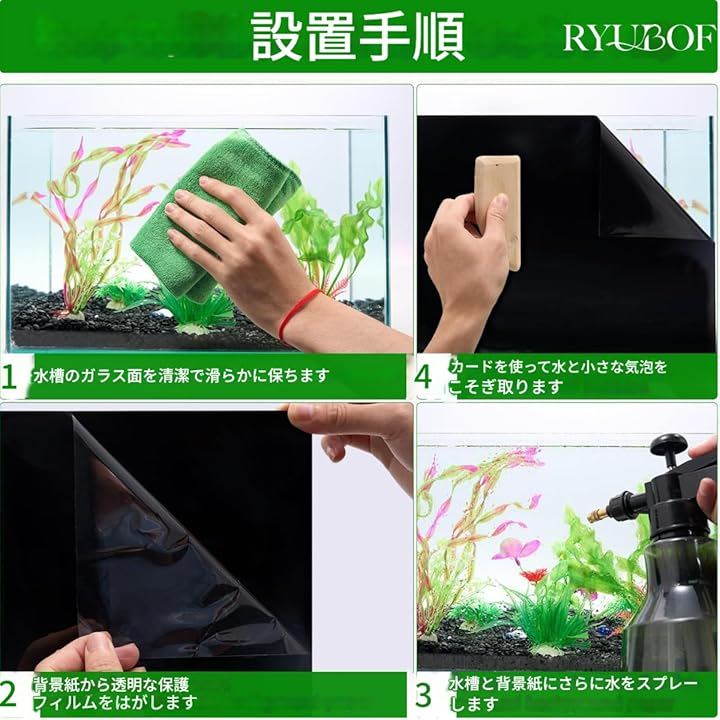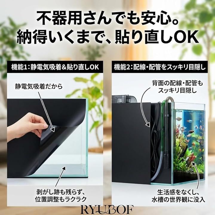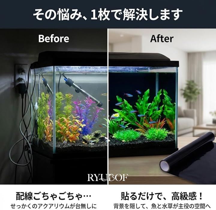「目隠しでスッキリ」背景シートを貼ることで背面の配線や配管を美しく隠し、観賞時に気になる部分をしっかりカバーします。