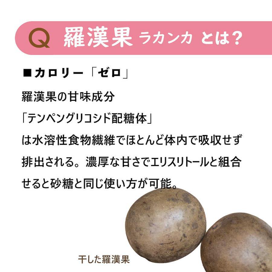 「神の実」羅漢果(らかんか ラカンカ)濃縮エキスに、天然「希少糖」エリスリトールを組み合わせ、プラス、低糖質ダイエットの強い味方「難消化性デキストリン(水溶性食物繊維)」を加えました。