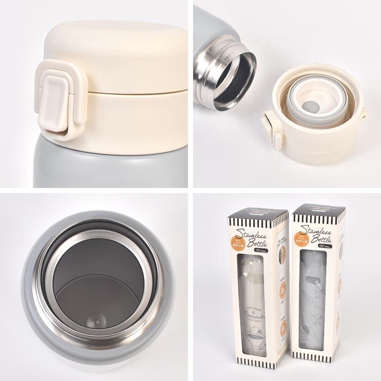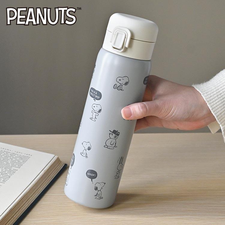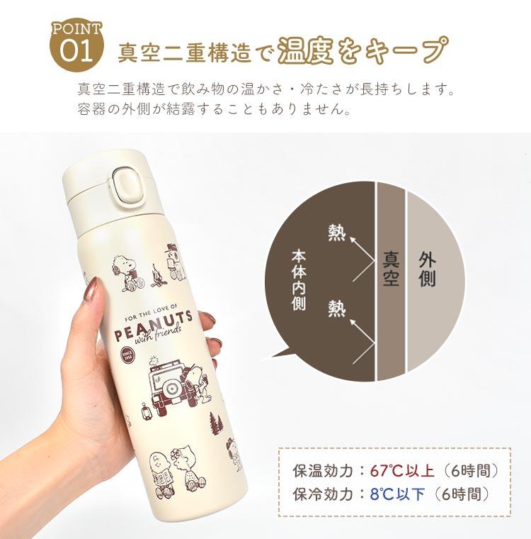 【ステンレスボトル 480ml】スヌーピーのデザインがかわいいステンレスボトル。真空二重構造で保温・保冷どちらもOK!オールシーズン使えます。ワンプッシュボタンで片手で開いて飲みやすい◎パーツは分解できるので衛生面でも安心です。