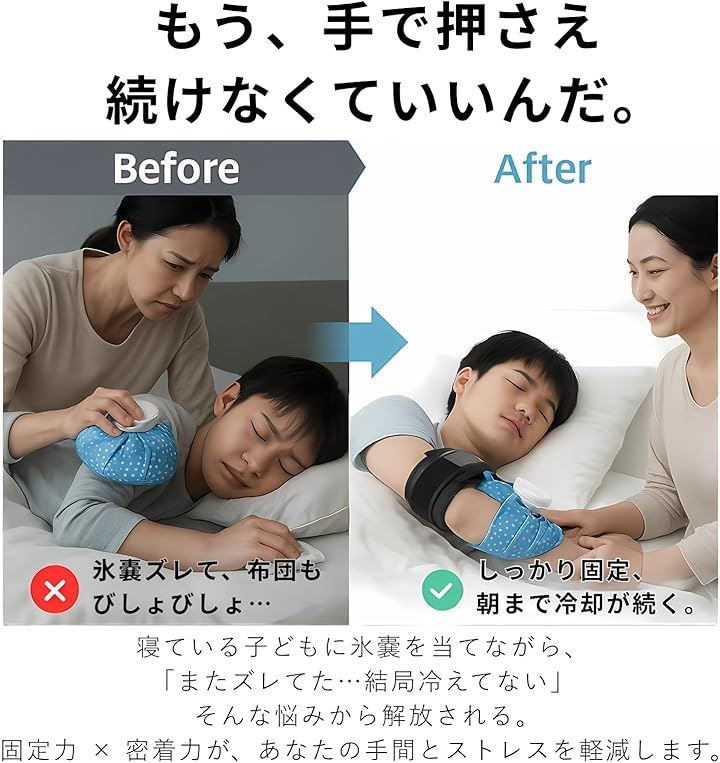 固定ベルトが氷嚢を密着させ、冷却効果を効率的に伝えます。