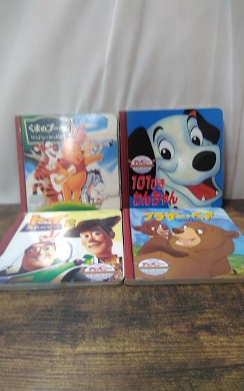 中古品です。「くまのプーさん」の表紙がちぎれています。表紙に汚れ、キズ、色あせ、シミ、スレがあります。中身に汚れ、キズ、色あせ、シミ、スレがあります。絵本、永岡書店「くまのプーさん、101ぴきわんちゃん、トイストーリー2、ブラザー・ベア」です。