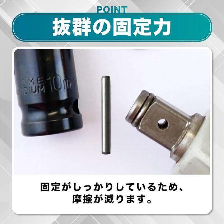 *ソケットサイズとピンの長さ目安 ソケットサイズ 8~20mm用(差込角9.5mm [3/8”])「サイズ」ピン:長さ 20mm:太さ 3mmm ソケットサイズ 7~26mm用(差込角12.7mm [1/2”])「サイズ」ピン:長さ 25mm:太さ 3mm ソケットサイズ 17~32mm用(差込角19.0mm [3/4”])「サイズ」ピン:長さ 30mm:太さ 3mm