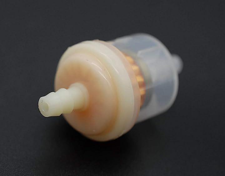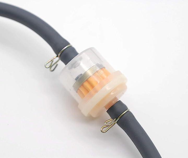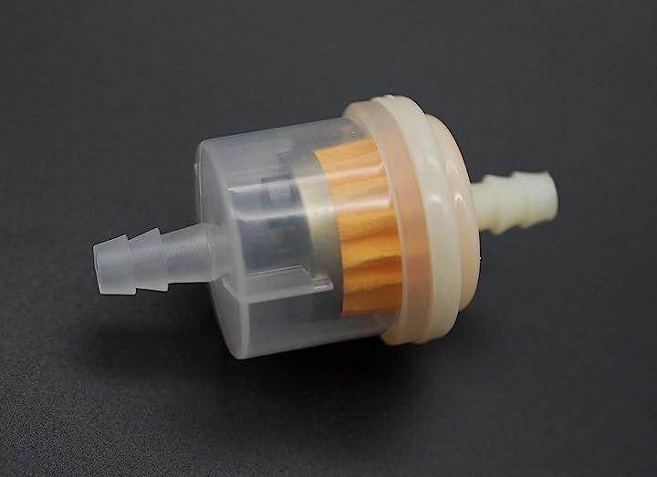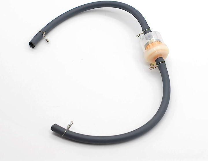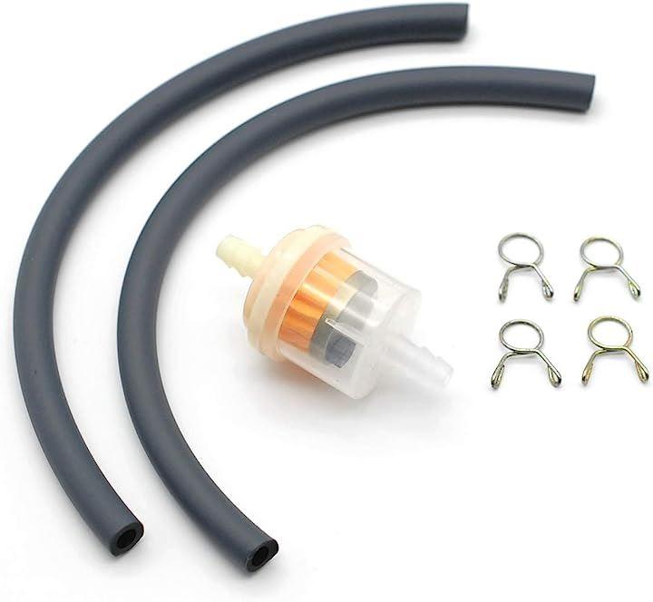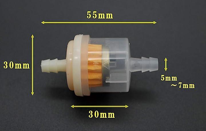汎用タイプ燃料フィルター1個、燃料ホース約20cm 2本、ホースバンド4個のセットです。