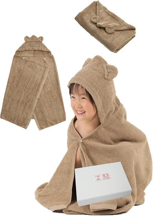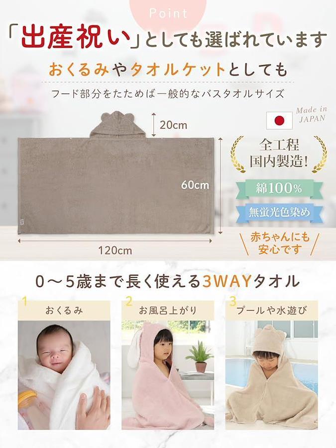 「成長してもずっと使える」0歳:おくるみ、1歳~:お風呂あがりの湯冷め防止に、3歳~:プールタオル、とお子さんも成長に合わせて長く使用でき、サイズは他のタオルと一緒なので保管しやすく、洗濯時の乾きやすさと「ふわふわ」を両方兼ね備えた生地の厚さになっています