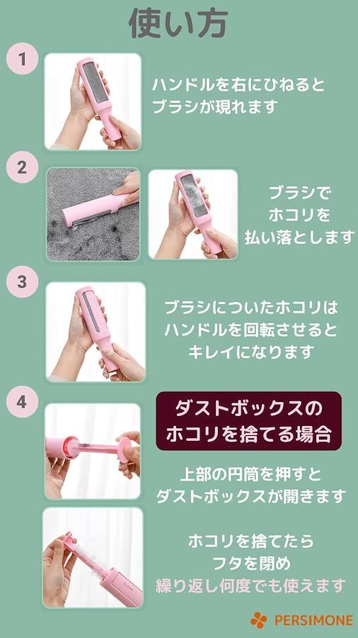 「ご利用方法」お掃除したい箇所を、ブラシで撫でるだけ(静電気でホコリやゴミを吸着させるため、衣類や生地などを傷めずにクリーニングできます)