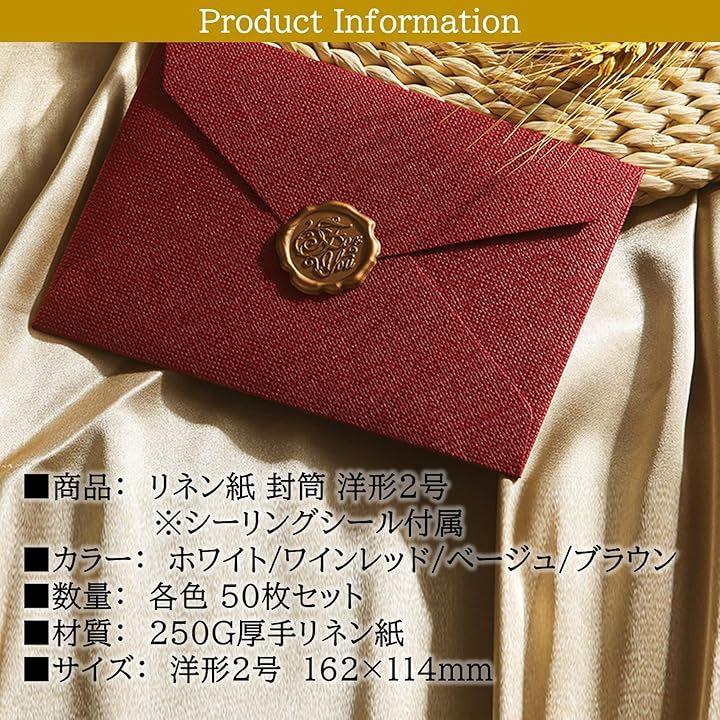 商品詳細: リネン紙 封筒 洋形2号(シーリングシール付)50枚 「カラー」 ホワイト/ワインレッド/ベージュ/ブラウン 「数量」50枚セット 「材質」 250G厚手リネン紙 「サイズ」洋形2号 162x114mm