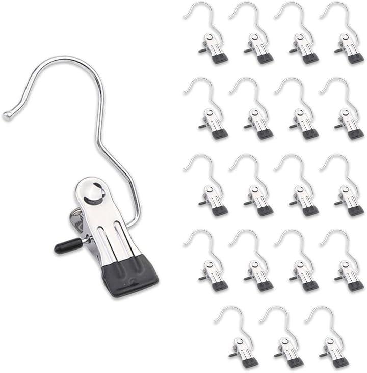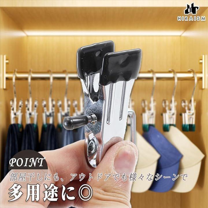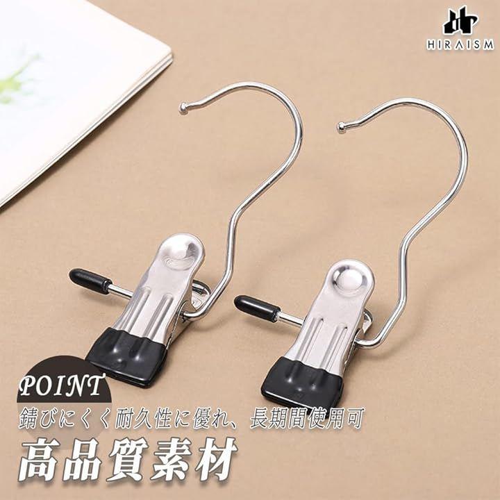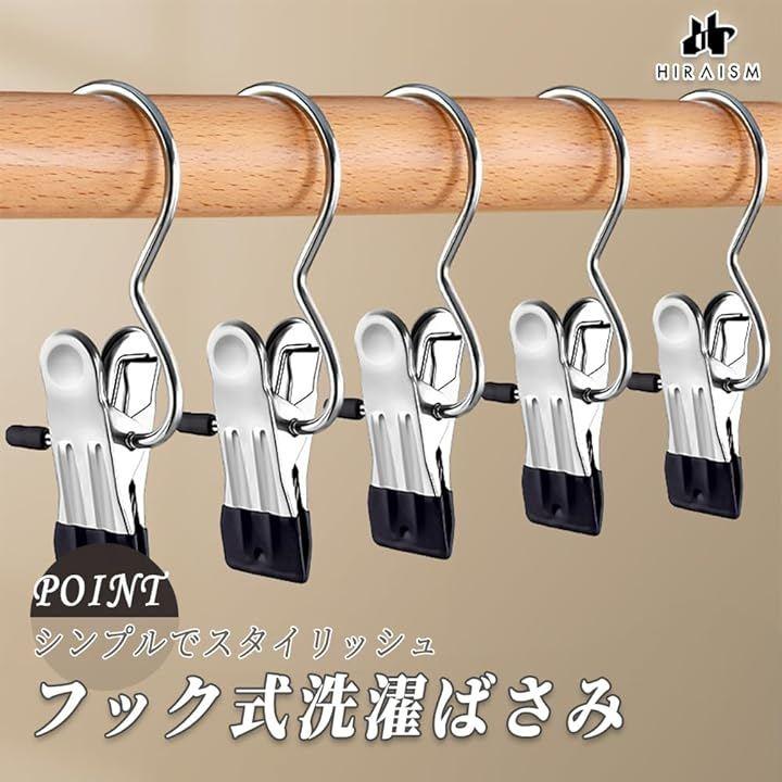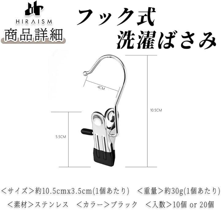 「商品内容」フック式洗濯ばさみ <サイズ>約10.5cmx3.5cm(1個あたり) <重量>約30g(1個あたり) <素材>ステンレス <カラー>ブラック <入数>10個 or 20個