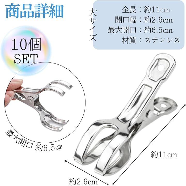 「商品内容」本体10個セット 「サイズ」全長:約11cm 開口幅:約2.6cm 最大開口:約6.5cm 「重量」約23g 「材質」ステンレス