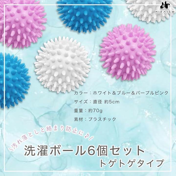 「商品内容」 洗濯ボール6個セット(トゲトゲタイプ) カラー:ホワイト/ブルー/パープルピンク サイズ:直径約5cm 重量:約70g 素材:プラスチック