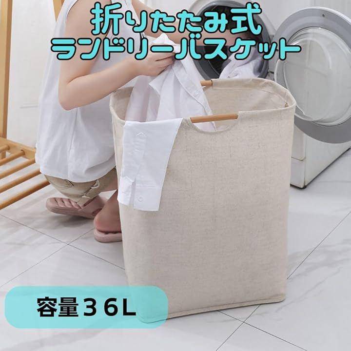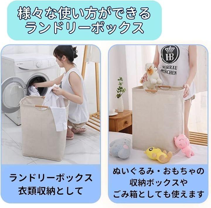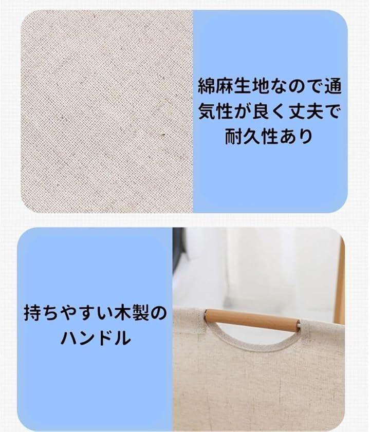 「商品詳細」(サイズ)30cmx30cmx40cm (容量)約60L (素材)綿麻生地 (カラー)オフホワイト (持ち手部分)持ち手のウッド部分は木材を使用しているため性質上、色合いが異なる場合がございます。