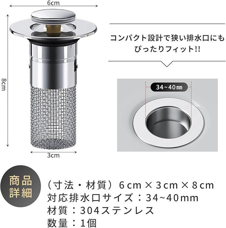 (寸法・材質)6 cm x 3 cm x 8 cm/対応排水口サイズ:34–40mm/材質:304ステンレス/数量:1個