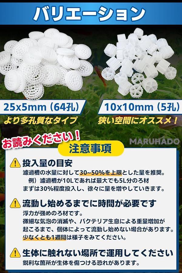 「製品仕様」材質:ポリエチレン、サイズ:直径(約)25mmx5mm 64孔、直径(約)10mmx10mm 5孔 投入する濾過槽の水量に対し、半分に当たる量を最大量として投入してください。