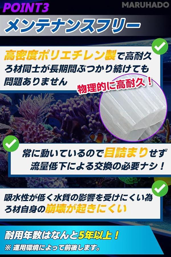 「特徴」流動濾過材とはMBBR(Moving bed biofilm reactor, 高効率流動床式生物膜担体処理)を用いた濾過材で、表面に生物膜を形成させ流動させることにより水中の有機物やアンモニア等の有害物質を効率よく分解できるアクアリスト必見アイテムです。