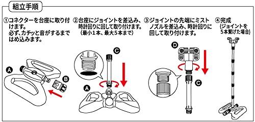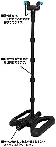 お庭でのガーデニング作業、アウトドア、キャンプの際の暑熱対策に。会社や工場での休憩所での納涼にも最適。工具不要で組立簡単!スタンドタイプなので、設置場所の移動に便利!高さは5段階調整可能。本体から外しても水が噴き出さないストップコネクター付き。ミスト噴射口は回転自在で上下左右どの方向にも霧吹きできます。ご家庭のホースに繋げるだけでミストを噴射、電気代がかからない。