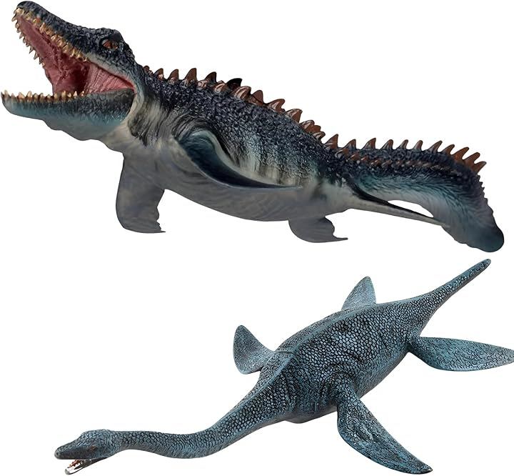 「大迫力のモササウルスとプレシオサウルス」 海の恐竜と呼ばれるモササウルス、そして古生物の代表格であるプレシオサウルス。