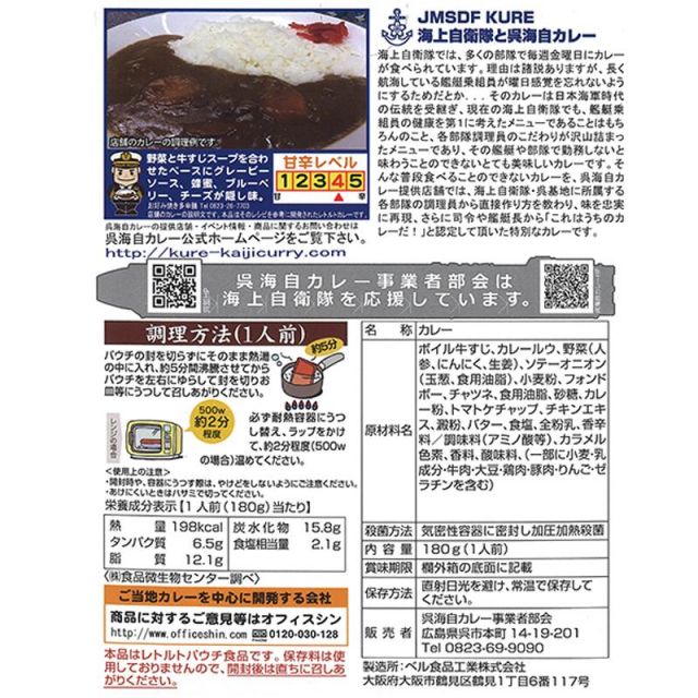 商品名:海上自衛隊 カレー レトルト 【 呉海自カレー ( 呉基地業務隊 )】 非常食 詰め合わせ制作協力:海上自衛隊 呉地方総監部海上自衛隊呉基地・艦艇のカレーが味わえると人気の「呉海自カレー」が、家でも気軽に味わえるようレトルトパウチになって登場。海上自衛隊の艦艇で食べられているカレーと同じ味をいつでも楽しめます。呉基地業務隊は、牛すじカレー。野菜類のスープと牛すじ肉のスープを合わせたベースに、グレービーソース・蜂蜜・ブルーベリージャム・とろけるチーズを隠し味に加えた味わい深い一杯。お土産としても人気です。【甘辛レベル 4】内容量:180g(1人前)