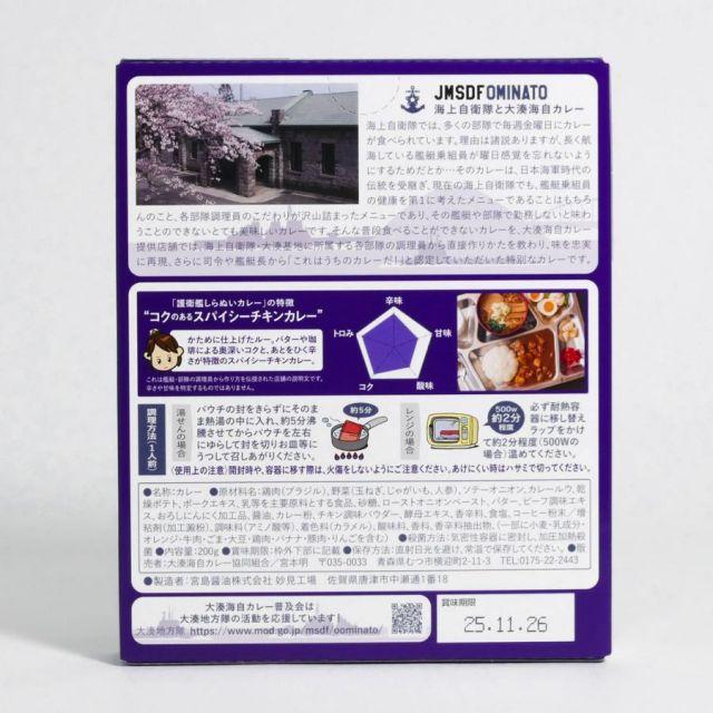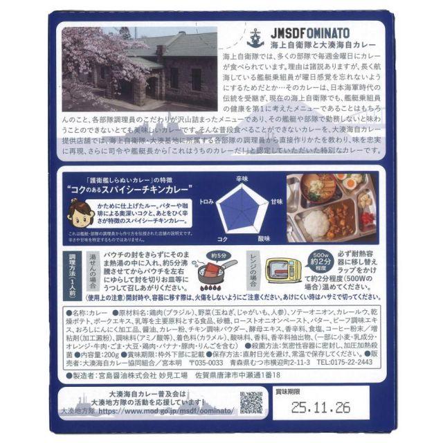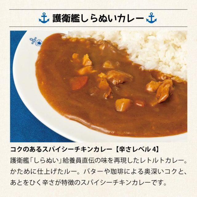 商品名:海上自衛隊 カレー レトルト おおみなと海自カレー( 護衛艦しらぬい )非常食 詰め合わせ ご当地 お取り寄せ 選べる セット大湊海自カレーは、海上自衛隊大湊基地所属の艦艇等各部隊で提供されているカレーを秘伝のレシピをもとに忠実に再現したカレーです。レシピや作り方は部隊から直接店舗に伝授されているため、実際に部隊で提供されているカレーの味を味わうことができます。護衛艦「しらぬい」給養員直伝の味を再現したレトルトカレー。かために仕上げたルー。バターや珈琲による奥深いコクと、あとをひく辛さが特徴のスパイシーチキンカレーです。【辛さレベル 4】内容量:200g保存方法:常温賞味期限:製造日から24ヶ月