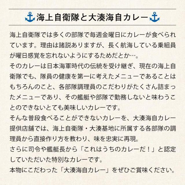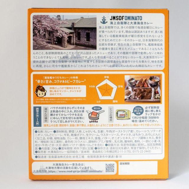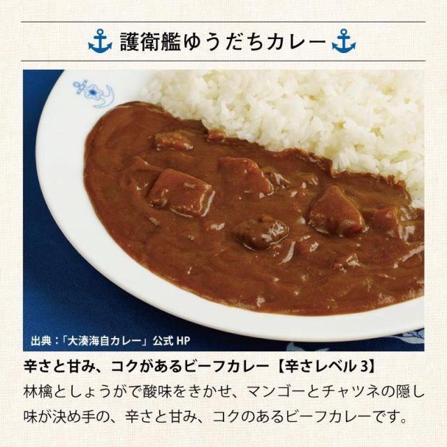 商品名:海上自衛隊 カレー レトルト おおみなと海自カレー( 護衛艦ゆうだち )非常食 詰め合わせ ご当地 お取り寄せ大湊海自カレーは、海上自衛隊大湊基地所属の艦艇等各部隊で提供されているカレーを秘伝のレシピをもとに忠実に再現したカレーです。レシピや作り方は部隊から直接店舗に伝授されているため、実際に部隊で提供されているカレーの味を味わうことができます。護衛艦ゆうだちのカレーは、辛さと甘み、コクがあるビーフカレー。林檎としょうがで酸味をきかせ、マンゴーとチャツネの隠し味が決め手の、辛さと甘み、コクのあるビーフカレーです。【甘辛レベル 3】内容量:200g保存方法:常温賞味期限:製造日から24ヶ月