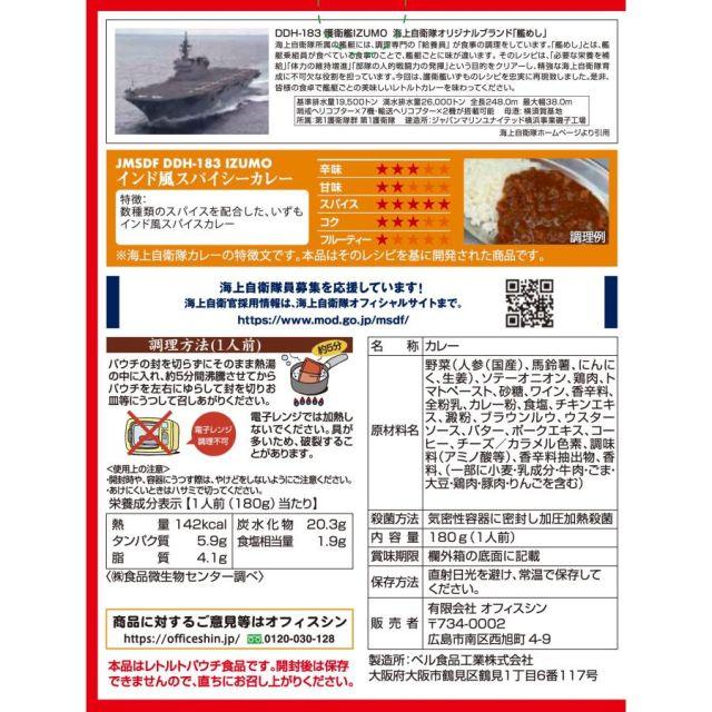 商品名:海上自衛隊 カレー レトルト 艦めし 護衛艦 いずも インド風スパイシーカレー 非常食 詰め合わせ ご当地 お取り寄せ 選べる セット 180g艦隊レシピを再現したカレーが味わえると好評の「艦めし」。「護衛艦いずも」のカレーは、じっくり炒めた玉ねぎと濃縮したトマトをベースに7種類以上の香辛料でスパイシーに仕上げたインド風。じっくり煮込んだ鶏肉は旨味たっぷりで、トマトの酸味とたまねぎの甘みのバランスが絶妙!じわじわと押し寄せるスパイスの辛みがクセになる美味しさです。■■■「艦めし」とは■■■海上自衛隊の艦艇や部隊で提供される食事のこと。 隊員たちが船上生活で曜日感覚を失わないようにするために、毎週金曜日に食べるカレーには艦艇や部隊それぞれに工夫があります。調理を専門とする隊員「給養員」の協力を経て作られたレシピをレトルトで再現しました。内容量:180g(1人前)
