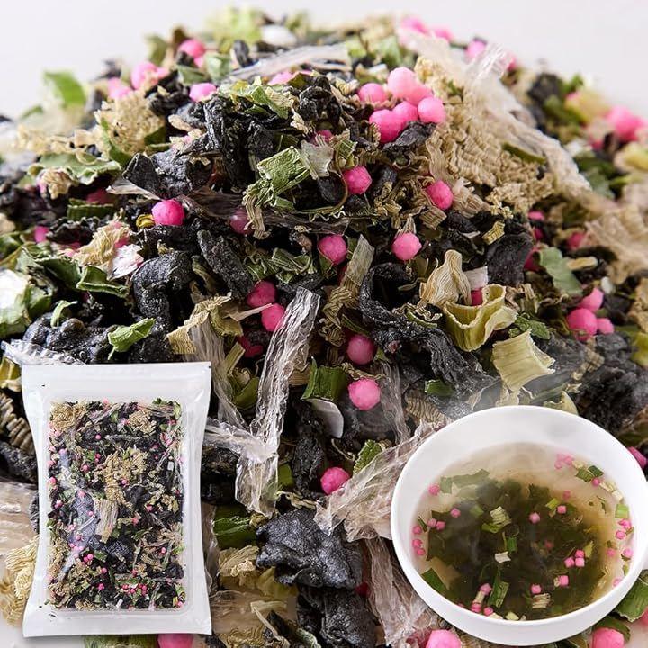 原材料::わかめ加⼯品(乾燥わかめ(わかめ(中国産))、コンソメ、梅⾁パウダー、⾷塩、砂糖、⾵味調味料)