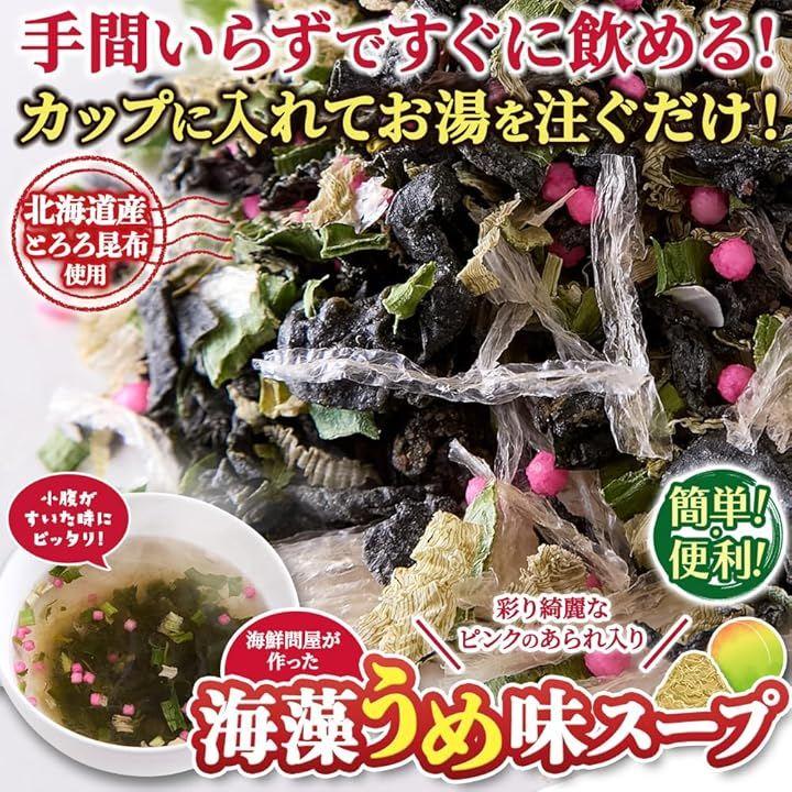 お湯を注ぐだけで簡単に風味豊かなスープの出来上がり。わかめ・めかぶ・昆布の風味豊かな海藻に梅を合わせたスッキリとしたスープです。