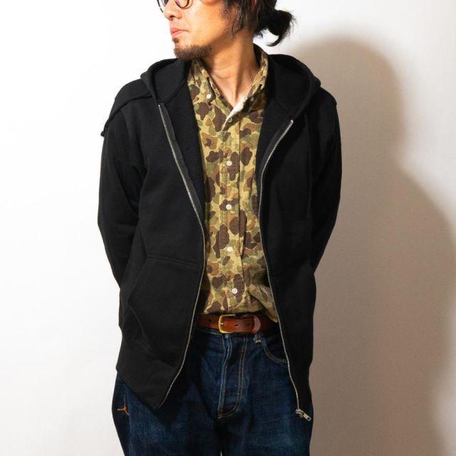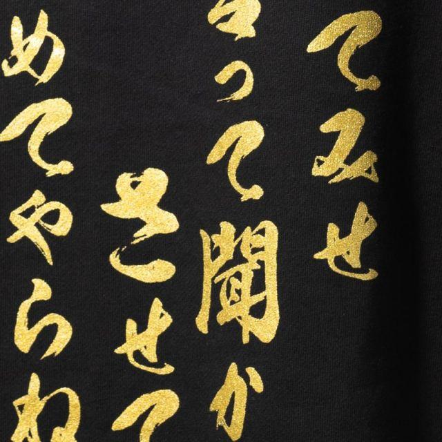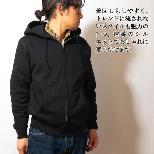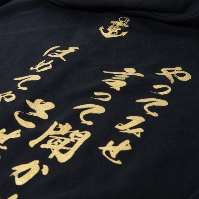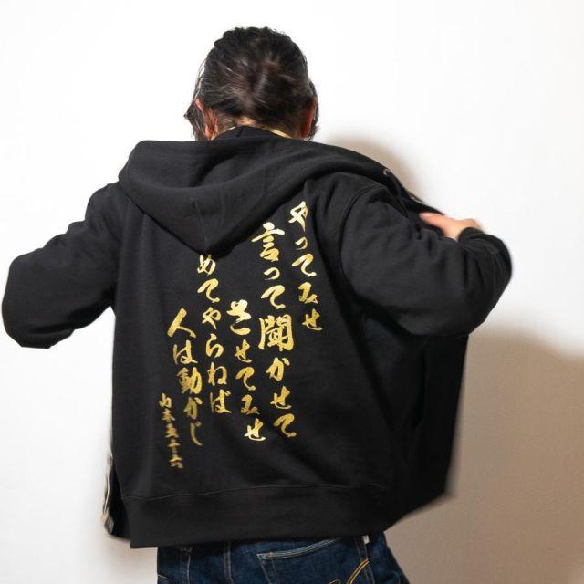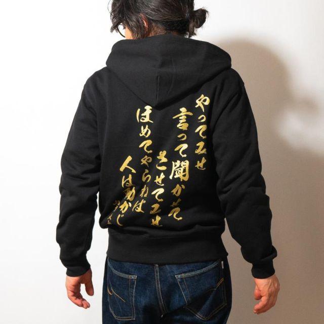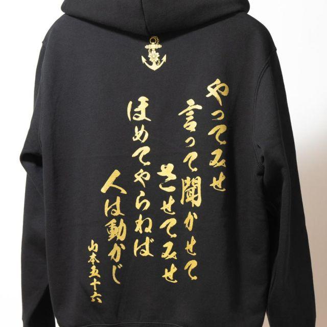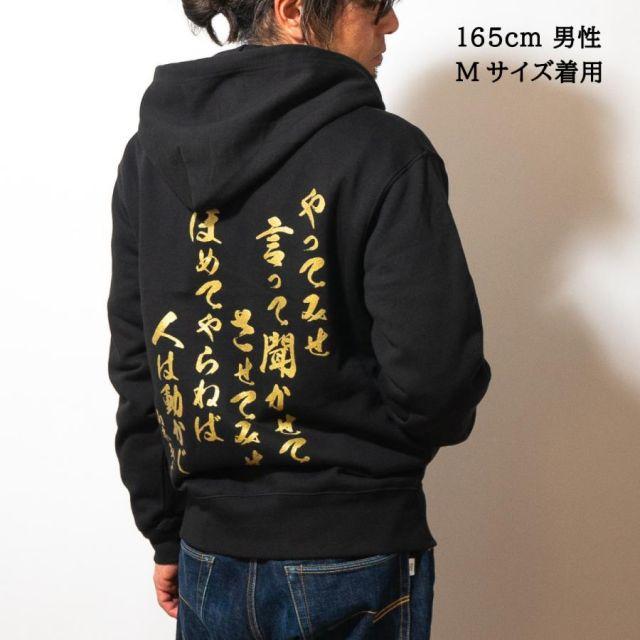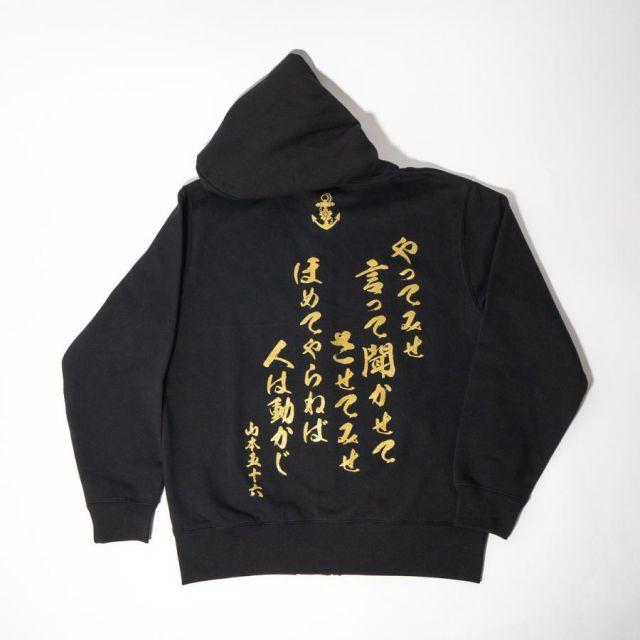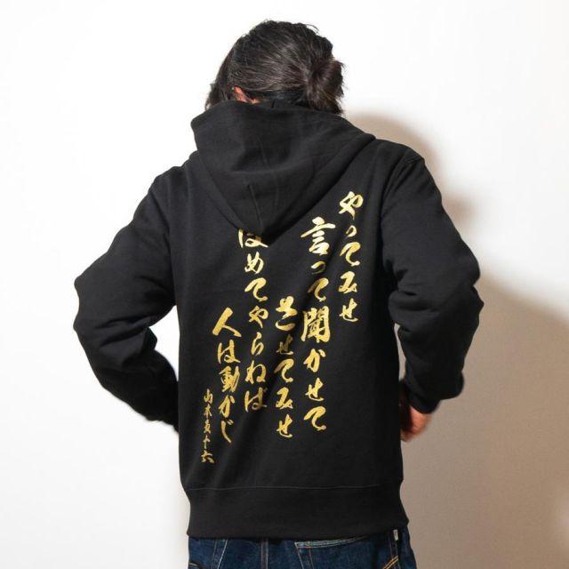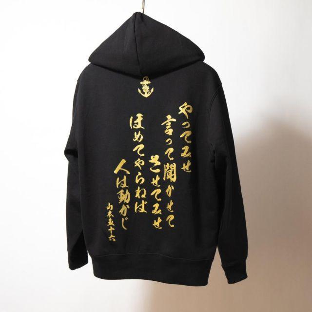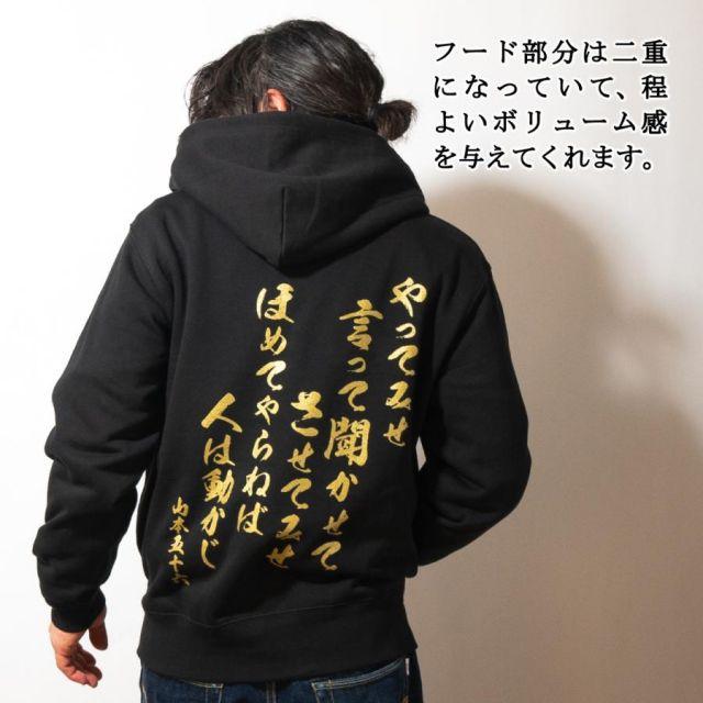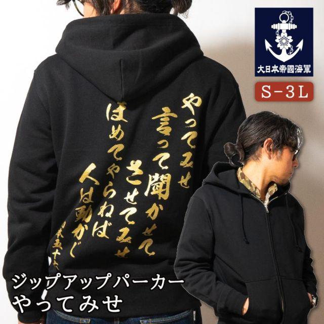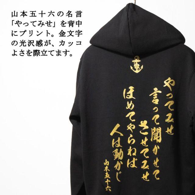 商品名:海軍 グッズ ジップアップ パーカー ( やってみせ ) 日本帝國海軍 山本五十六 グッズ格言 聯合艦隊 グッズ メンズ レディース 男女兼用山本五十六の格言「やってみせ」を背中にプリントしたジップアップパーカー。金文字の光沢感がカッコよさを際立てます。裏地は伸縮性と吸水性のある裏パイル(裏毛)仕様。ガシガシ使えるタフな生地厚でありながらも、肌触りがよくやわらかい着心地。季節の変わりめの重ね着や室内着など、さまざまなシーンで使いたい1着です。フード部分は二重になっていて、程よいボリューム感を与えてくれます。着回しもしやすく、トレンドに流されないスタイルも魅力の1つ。定番のシルエットでおしゃれに着こなせます。<カラー>ブラック<サイズ>M:胸囲110・着丈67・肩幅48・袖丈60L:胸囲116・着丈71・肩幅52・袖丈61LL:胸囲126・着丈76・肩幅55・袖丈623L:胸囲136・着丈81・肩幅58・袖丈634L:胸囲146・着丈84・肩幅61・袖丈64<素材> 綿100%・裏パイル(10oz)商品番号:g1904m