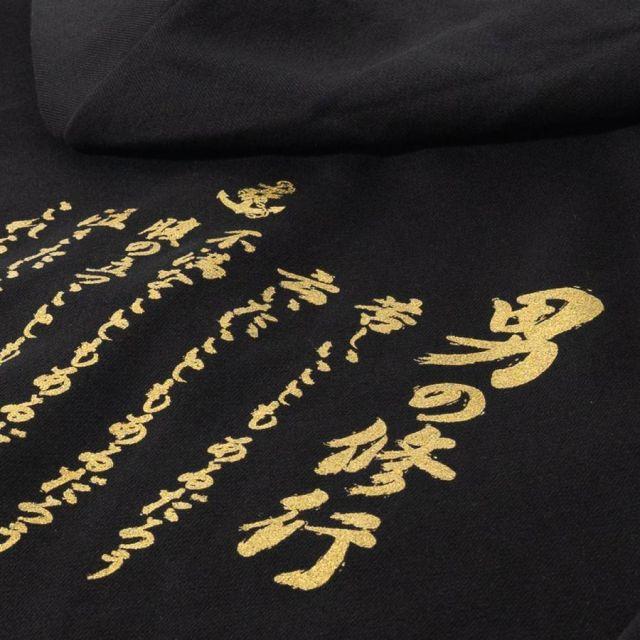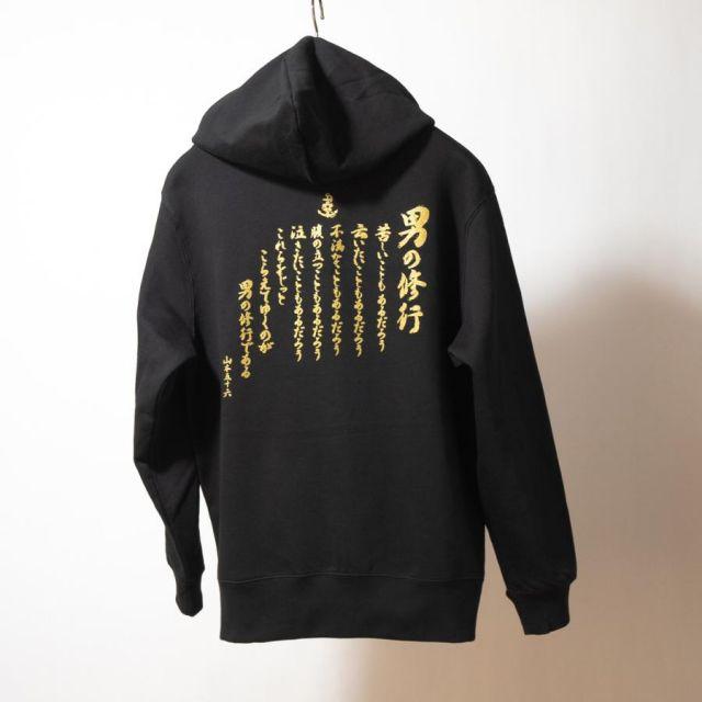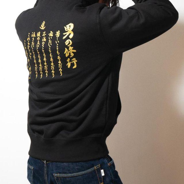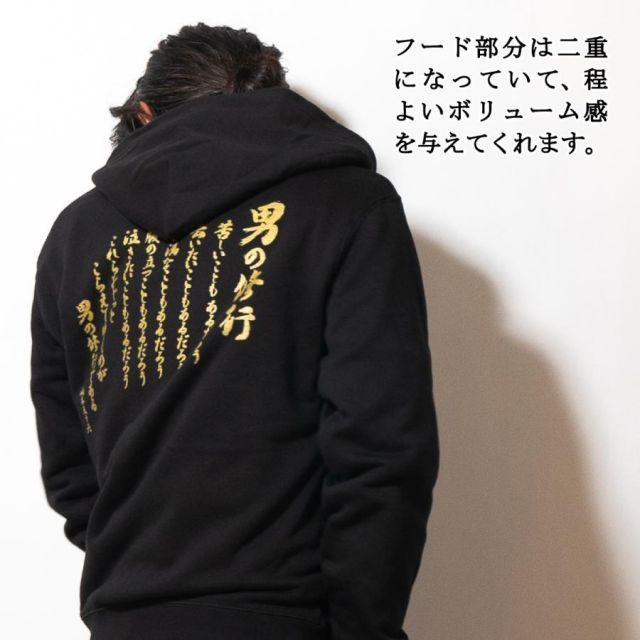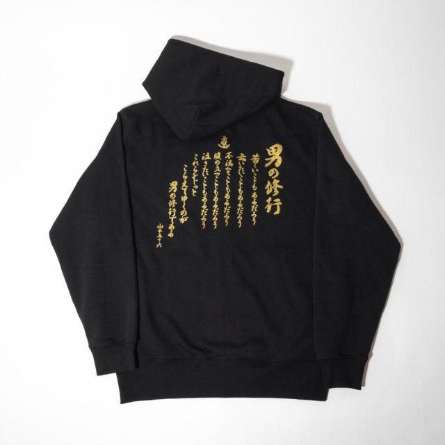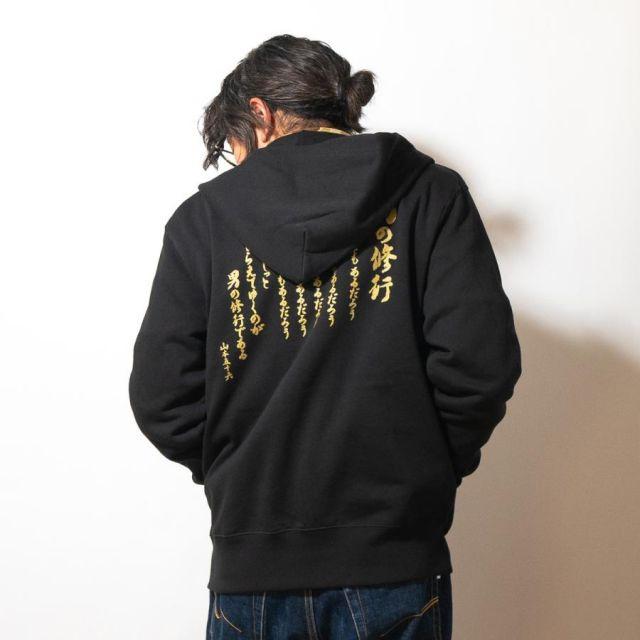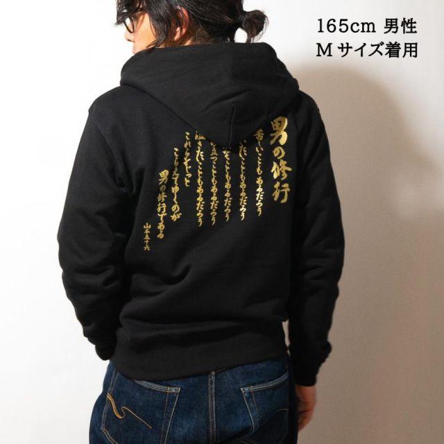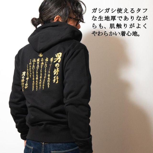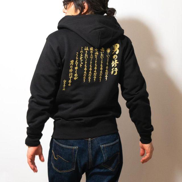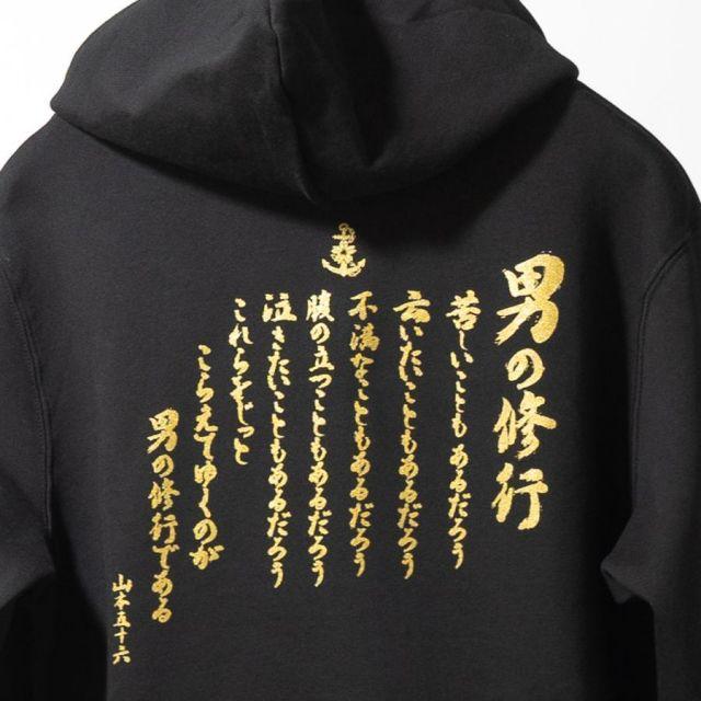 商品名:海軍 グッズ ジップアップ パーカー ( 男の修行 ) 日本帝國海軍 山本五十六 グッズ格言 聯合艦隊 グッズ メンズ レディース 男女兼用山本五十六の格言「男の修行」を背中にプリントしたジップアップパーカー。金文字の光沢感がカッコよさを際立てます。裏地は伸縮性と吸水性のある裏パイル(裏毛)仕様。ガシガシ使えるタフな生地厚でありながらも、肌触りがよくやわらかい着心地。季節の変わりめの重ね着や室内着など、さまざまなシーンで使いたい1着です。フード部分は二重になっていて、程よいボリューム感を与えてくれます。着回しもしやすく、トレンドに流されないスタイルも魅力の1つ。定番のシルエットでおしゃれに着こなせます。<カラー>ブラック<サイズ>M:胸囲110・着丈67・肩幅48・袖丈60L:胸囲116・着丈71・肩幅52・袖丈61LL:胸囲126・着丈76・肩幅55・袖丈623L:胸囲136・着丈81・肩幅58・袖丈634L:胸囲146・着丈84・肩幅61・袖丈64<素材> 綿100%・裏パイル(10oz)商品番号:g1902m
