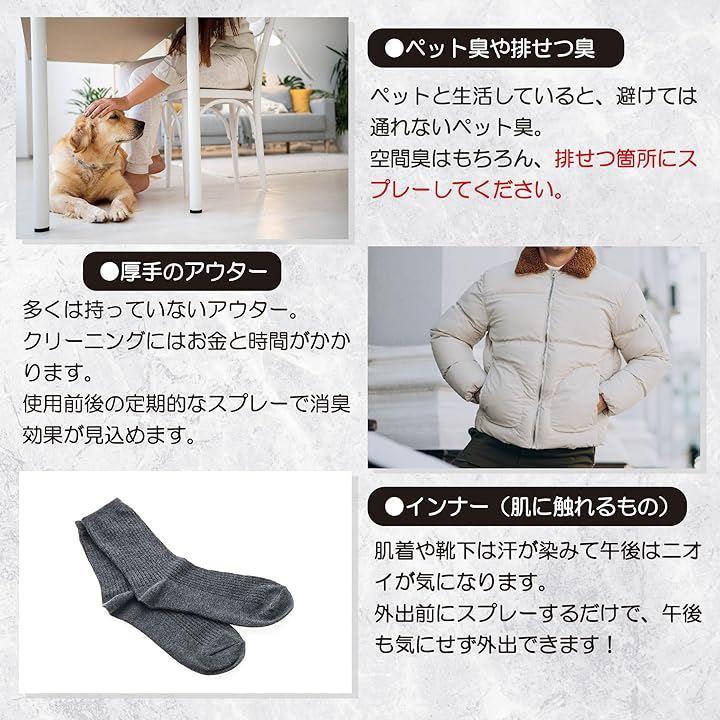 汗臭、排せつ臭、足裏臭、口臭、加齢臭、腐った魚臭等、強烈な刺激臭へも効果実証済み。