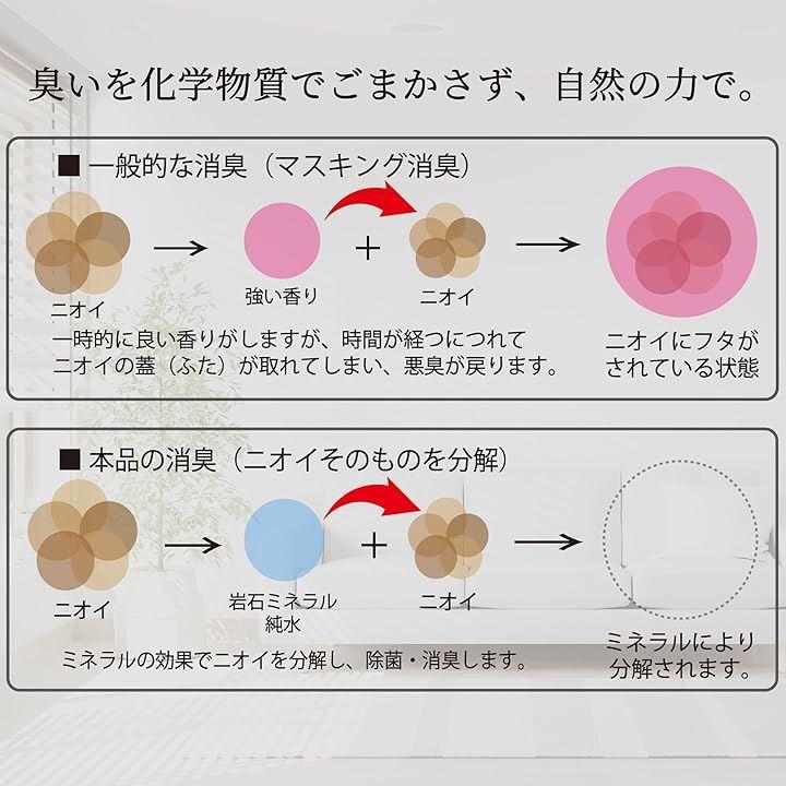 成分は岩石ミネラルと純水のみ。 香料を被せてニオイをマスキングして消臭する方法とは異なり、ニオイそのものを分解して消臭します。