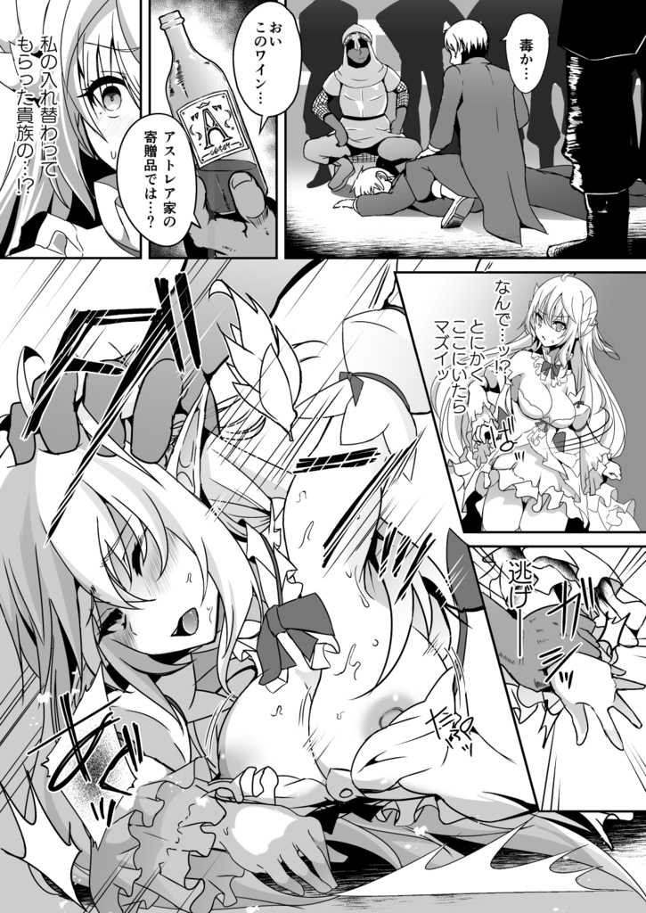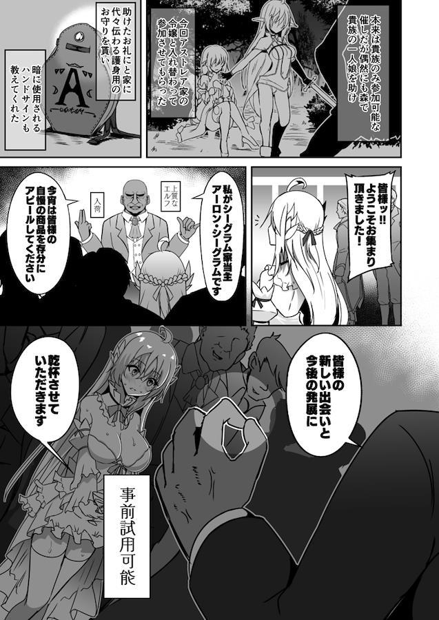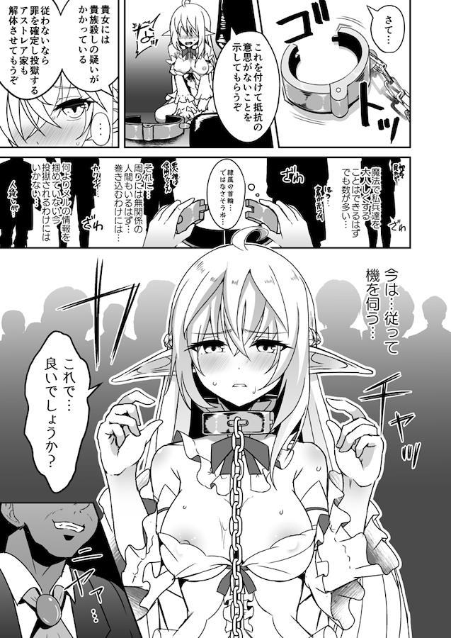 攫われた仲間の情報を得るため、陰謀渦巻く貴族の晩餐会に、令嬢に変装して潜入するエルフの少女イヨ。しかし罠にはめられ、貴族殺しの濡れ衣を着せられて、捕まってしまう。身の潔白を示すために自ら服を脱がされ、半裸・スカートたくし上げで、衆人観衆の中、鎖を引かれ会場を引き回される。エルフの正体がバレないように、恥辱に耐えながら言いなりになるイヨだったが…