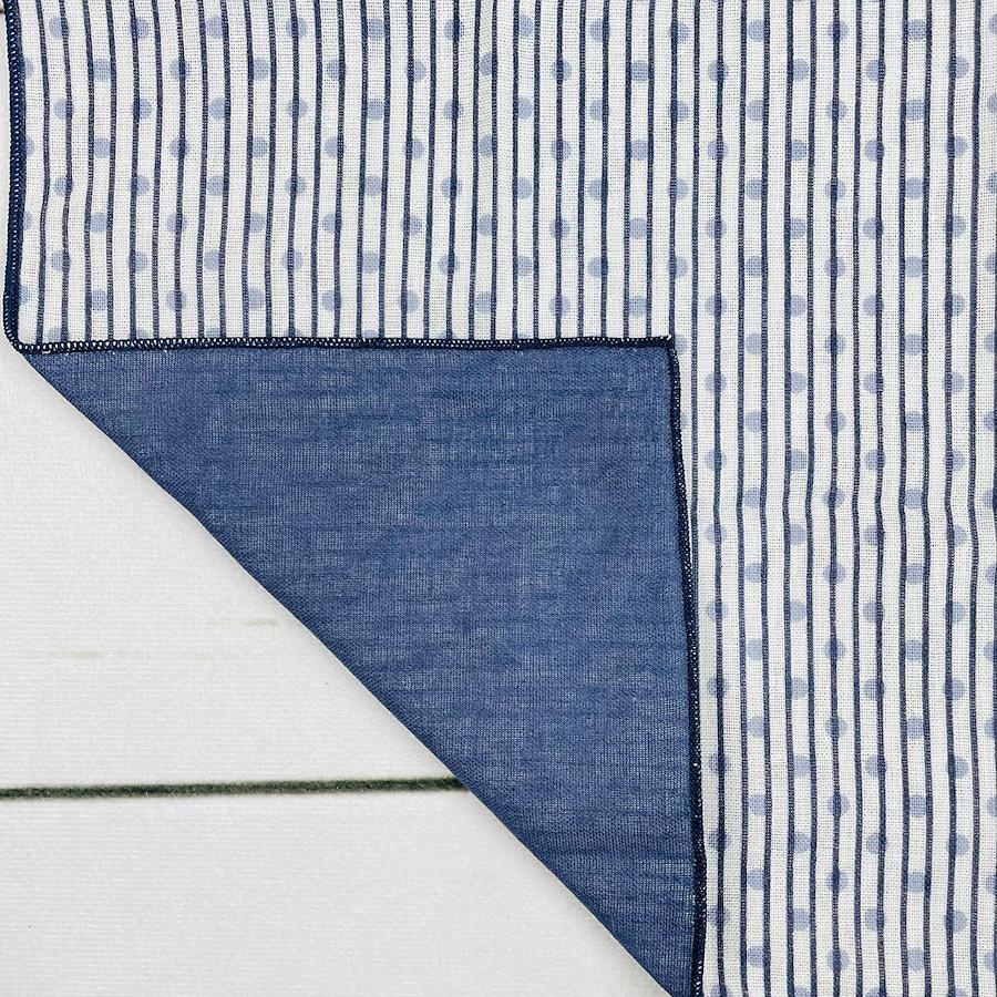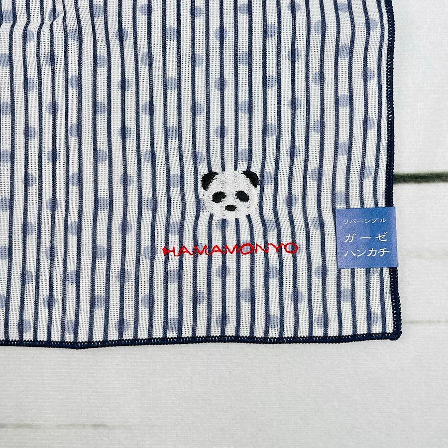 やわらかな3重ガーゼ素材のハンカチです。捺染によるきれいな色合いで、刺繍がワンポイントアクセントに。表と裏で異なるリバーシブル仕様となっています。