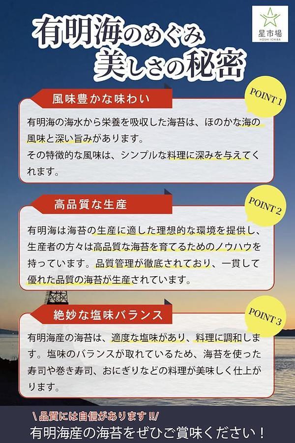 名称:焼海苔原材料:乾海苔(有明海産)内容量:枚のり15枚 賞味期限:パッケージに記載保存方法:直射日光、高温多湿を避け保存。