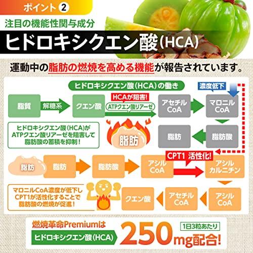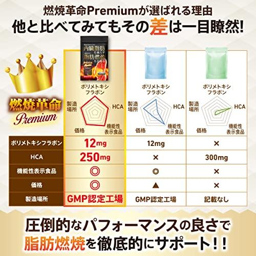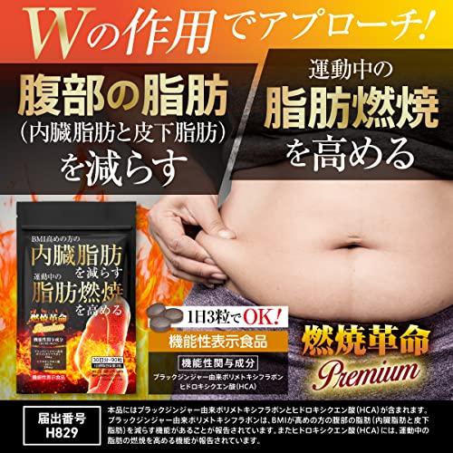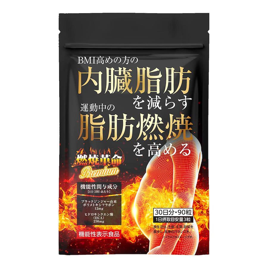 ??【燃焼革命がパワーアップして登場!】??燃焼革命Premiumは、腹部の脂肪(内臓脂肪・皮下脂肪)と脂肪燃焼に特化した機能性表示食品になります。従来品から「HCA」や「ポリメトキシフラボン」を配合しWの作用でサポート!シリーズ最高峰の商品となっております。 【届出番号】H829【届出表示】本品にはブラックジンジャー由来ポリメトキシフラボンとヒドロキシクエン酸(HCA)が含まれます。ブラックジンジャー由来ポリメトキシフラボンは、BMIが高めの方の腹部の脂肪(内臓脂肪と皮下脂肪)を減らす機能があることが報告されています。 またヒドロキシクエン酸(HCA)には、運動中の脂肪の燃焼を高める機能が報告されています。【1日摂取目安量】3粒 【機能性関与成分】ブラックジンジャー由来ポリメトキシフラボン:12㎎/日、ヒドロキシクエン酸(HCA):250m(1袋90粒入り 30日分) 【サポート成分も豊富に配合】ショウガエキス、ヒハツエキス、カプサイシン、L-カルニチン、αリポ酸、アフリカマンゴノキエキス、コエンザイムQ10、カフェイン、カテキン、マルチビタミン11種を配合し圧倒的パフォーマンスを実現! 【こんな方にお勧め!】腹部の脂肪(内臓脂肪と皮下脂肪)が気になる方、効率的に運動でダイエットしたい方、普段の生活(家事や通勤など)を有効活用したい方などにお勧めです! 【GMP認定国内工場で製造】厳選した材料はもちろん、お客様に安心していただける製品をご提供できるよう、 医薬品と同等の徹底した品質管理のもと日本国内で製造を行っております。
