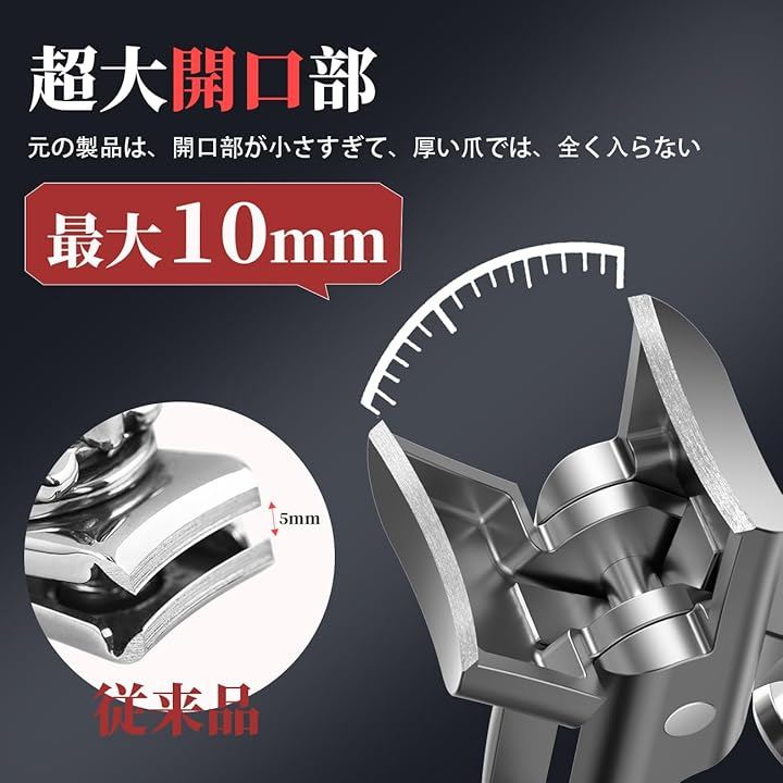 「機能性爪切り」爪切りの口部分が最大約10mm開き、分厚い爪や巻き爪でも問題なく切ることができます。
