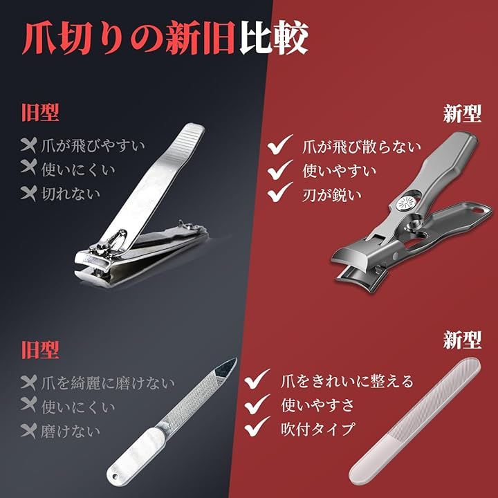 「爪やすり付き」:この爪切りは繊細な爪やすりが付属して、爪を綺麗になる同時に傷つけず、硬い爪、太い爪、巻き爪などにも適応可能です。