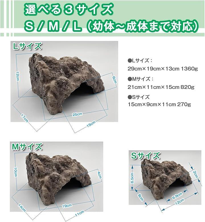 適切なサイズで生体の成長をサポート S、M、Lの3段階サイズ展開で、幼体期から成熟期まで、生体の成長に合わせて最適なシェルターを選べます。