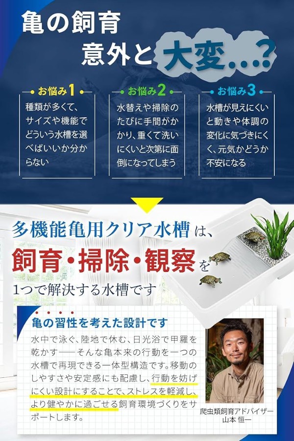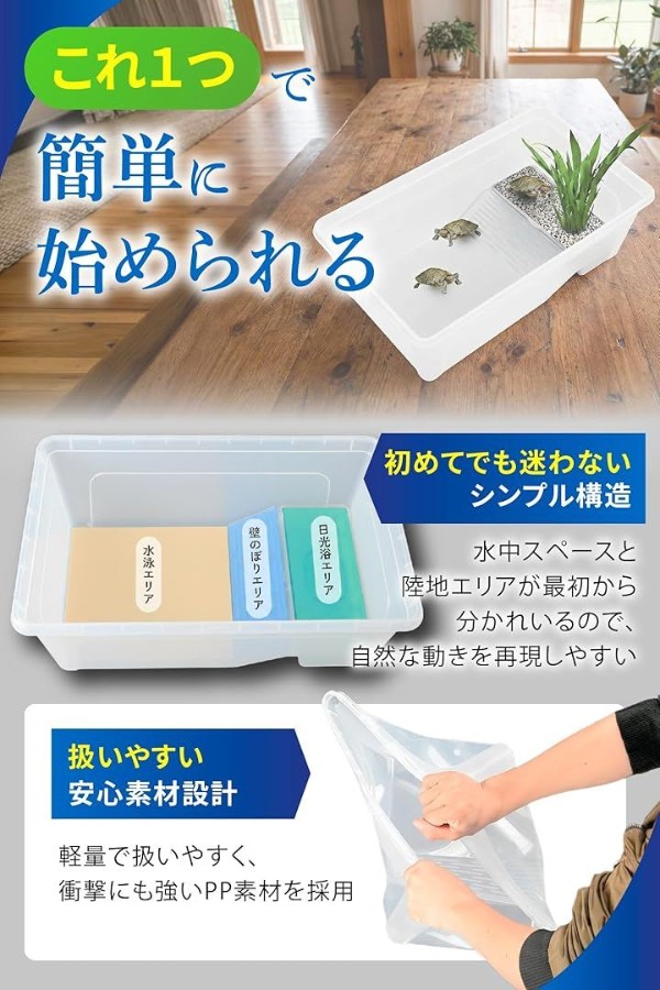 「自然に近い水陸構造」 遊泳・陸地・日光浴を一つにまとめた設計で、亀の本来の行動を妨げにくく、ストレスを抑えた飼育環境を実現します。