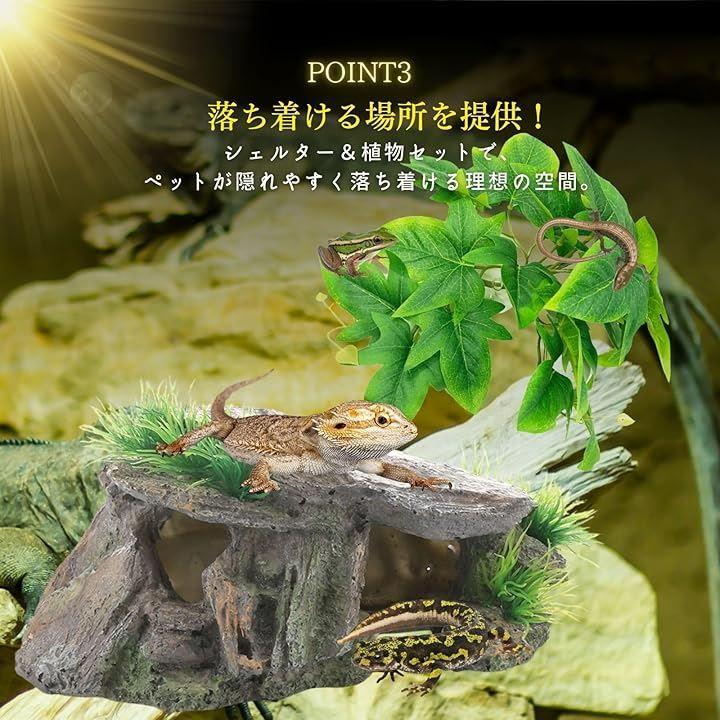 セット使いで見た目も機能もアップ:爬虫類シェルターと植物をセットで使うことで、水槽やケージに奥行きのあるデザインが完成。