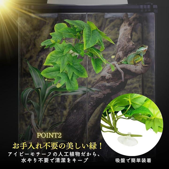 リアルな人工植物で手入れ不要:アイビーモチーフの人工植物は吸盤付きで、ガラスケージにも簡単取り付け。
