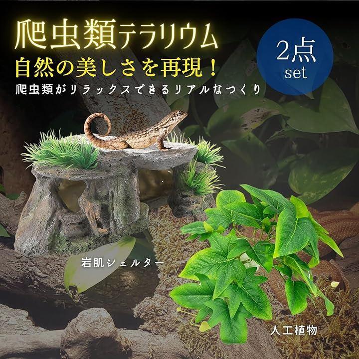 自然な環境を手軽に再現。爬虫類に最適なシェルターと人工植物セット:リアルな岩肌の爬虫類 シェルターと、アイビーモチーフの人工植物で、ケージや水槽に自然の美しさと隠れ家を同時に提供。