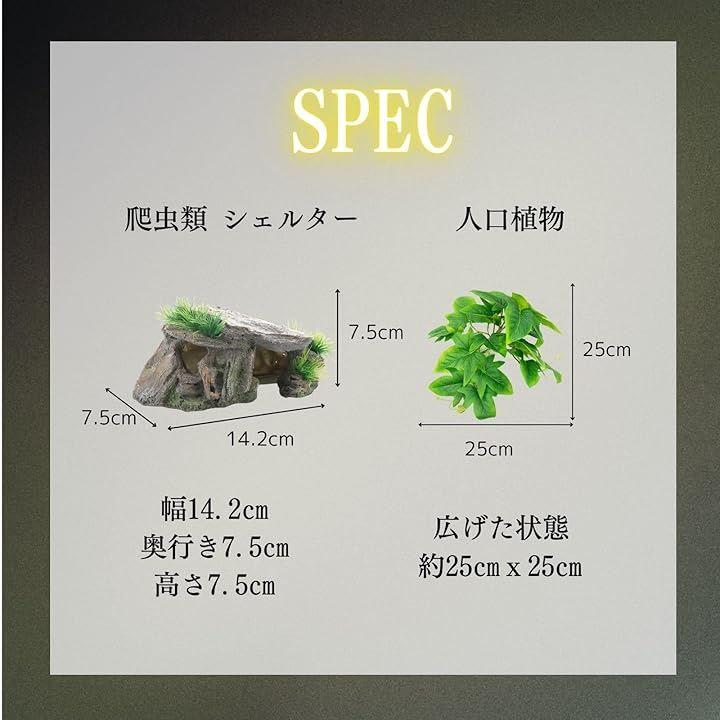 サイズ:爬虫類 シェルター(幅14.2cmx奥行き7.5cm、高さ7.5cm)、人口植物(広げた状態:約25cmx25cm)