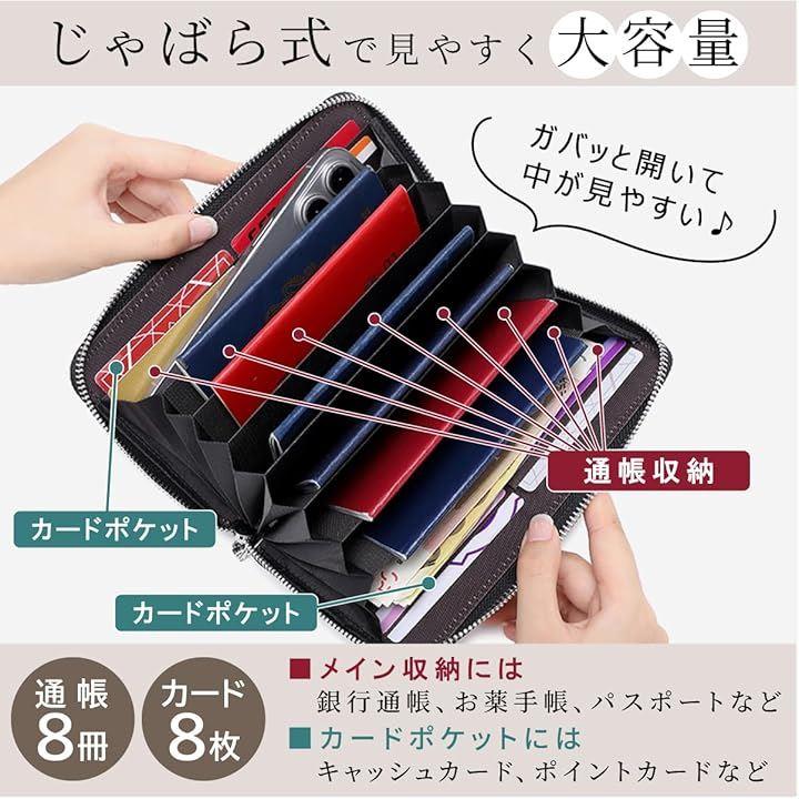 *銀行の窓口やATMなどでもたつかずスムーズ。 「大容量の収納力」 *通帳8冊、カードが8枚収納できるので、家族全員分の通帳もまとめて収まる *通帳だけではなく、保険証、診察券、お薬手帳をまとめて収納したり、パスポート、旅券、チケット等をいれて旅行ポーチに、御朱印帳やお守り入れに、用途に合わせてお使いいただけます。