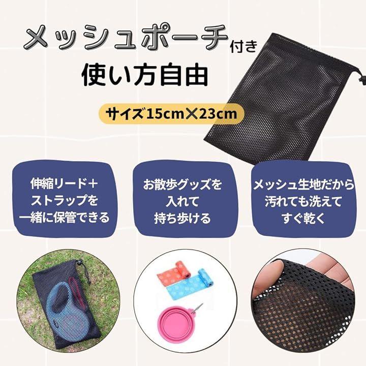 「便利なメッシュポーチ付き」リードとストラップをセットで収納したり、お散歩時に必要なものを入れて持ち運んだりと自由にお使いいただけます。