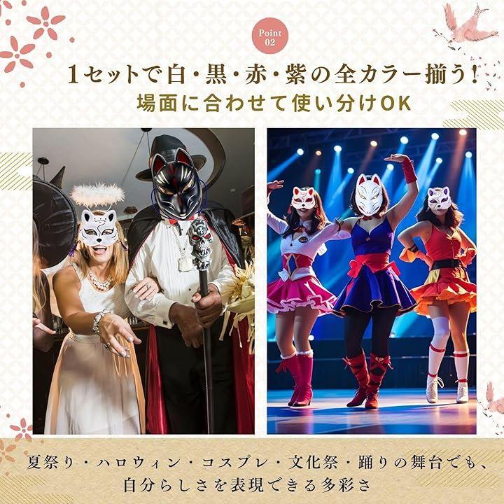 セット内容とサイズ:顔全体を覆う狐のお面(きつね白x1とキツネ黒x1)縦22cm 横14.5cm と、顔の半分を覆うきつね面(赤x1、黒x1、紫x1)縦17cm 横18.5cm 紐の色などは、生産ロットにより変更になる場合がございます。