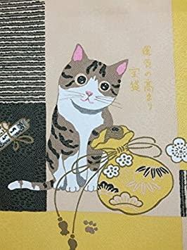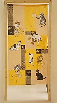 通常1-5営業日で発送:猫柄のれん幅85×170cm丈ロングサイズ 和風「貼り絵七福ねこ YE」cos10502