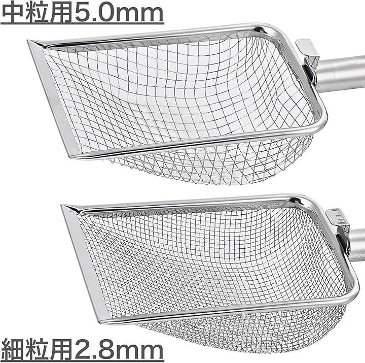 丈夫なステンレス製メッシュ構造で、網目サイズは2.8mmと5.0mmの2種類。