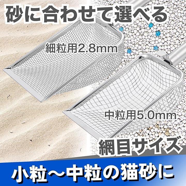 細かい網目2.8mmはベントナイトなどの細粒タイプに、5.0mmはおから・鉱物系などの中粒タイプに最適。