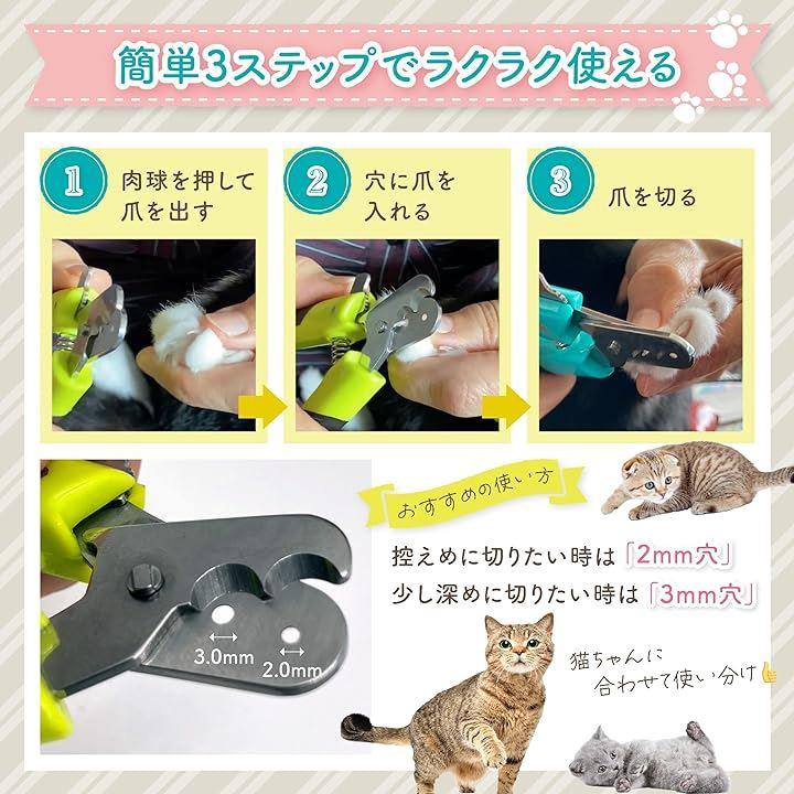 爪を挿し込む穴が二つ(直径2mmと直径3mm)あるので、猫の爪のサイズや成長に合わせて使い分けることが出来ます。