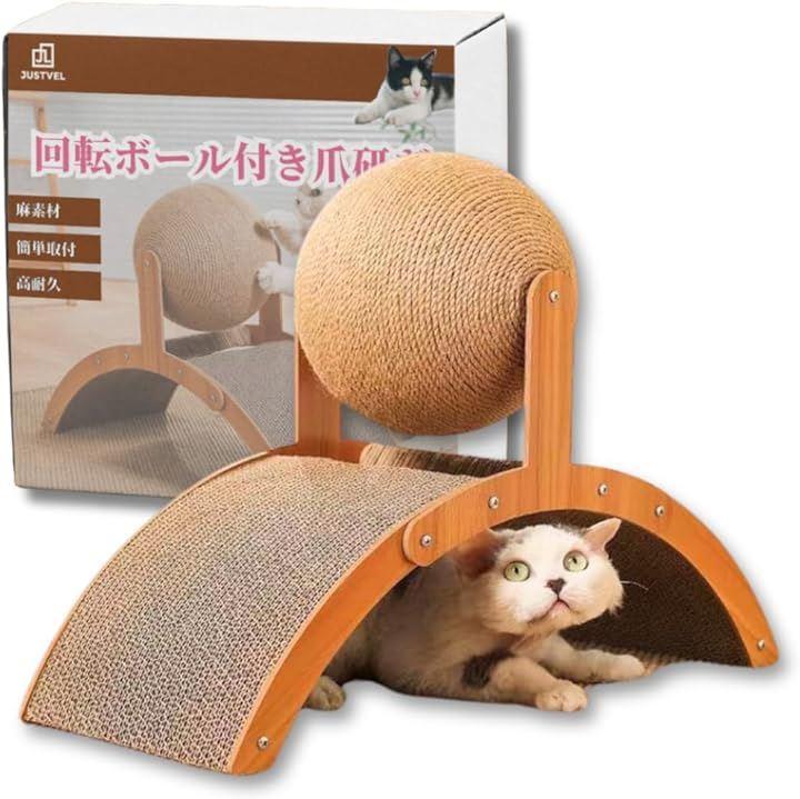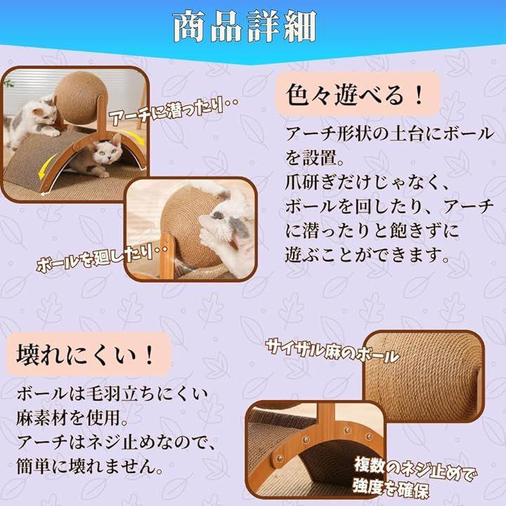 「多機能な猫用爪研ぎ」アーチ型のデザインと回転ボールを組み合わせたこの猫用爪研ぎは遊びながら爪を研ぐことができる優れものです。