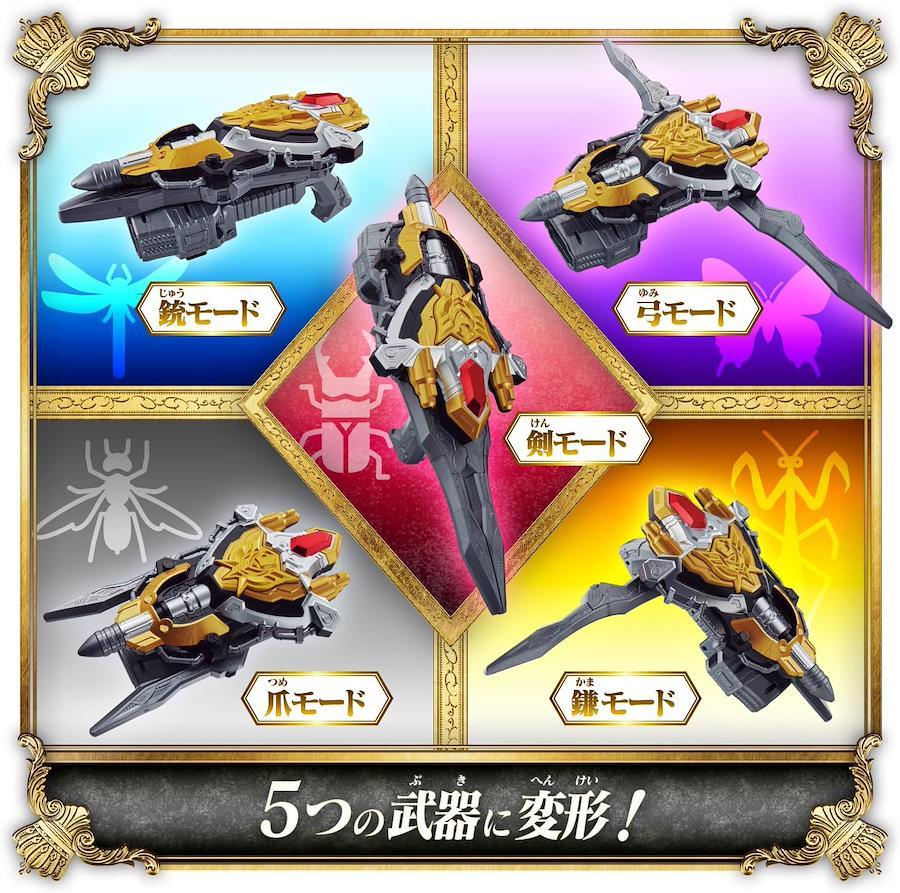 盾から銃・弓・鎌・剣・爪の5つのモードに変形し、キングオージャー5人それぞれの武器なりきり遊びができます。